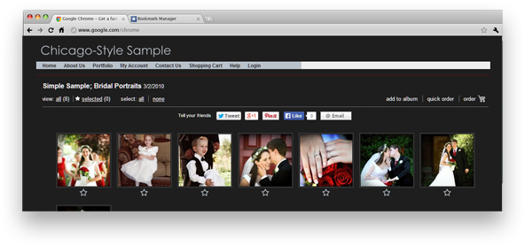 PhotoReflect gives your customers a great experience using your web storefront. Your photos are presented in your professional website for easy proofing and selection. Your customers can mark their favorites as well as add them to their own custom albums.